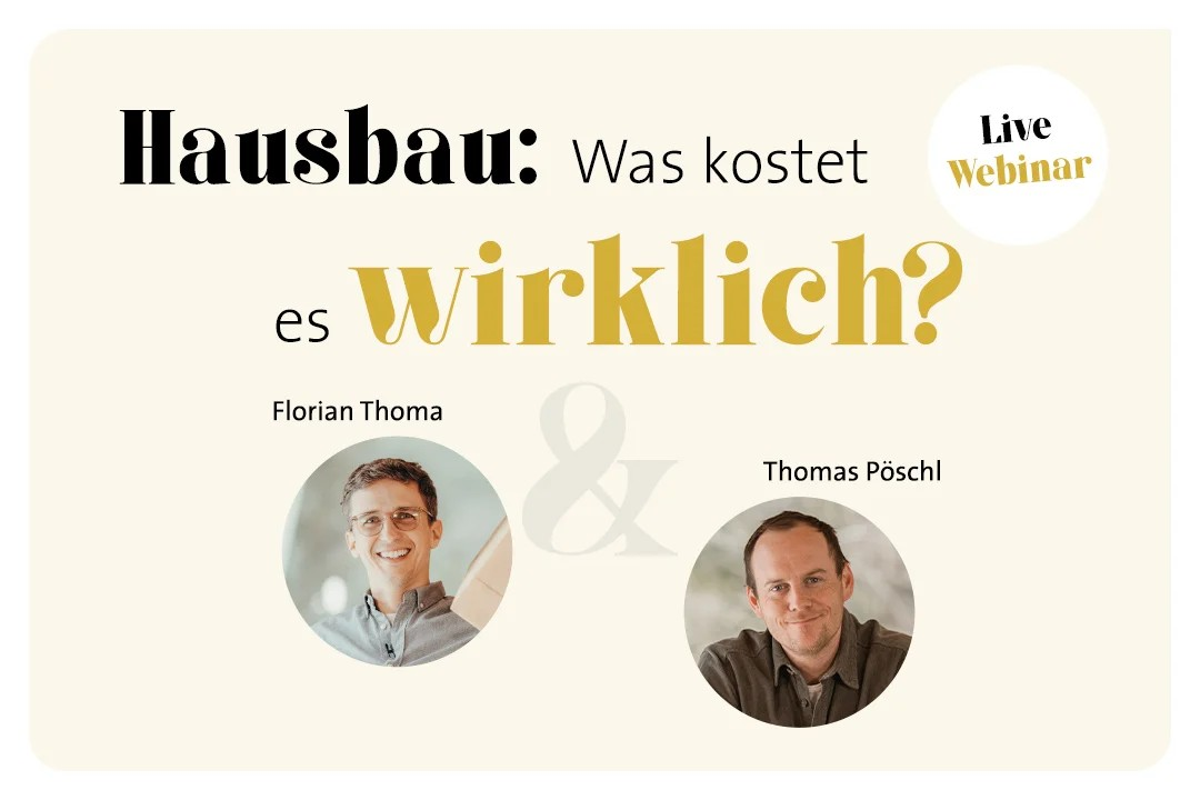 In unserem kostenlosen Webinar zeigen euch Florian und Thomas, mit welchen Kosten ihr wirklich beim Hausbau rechnen müsst. Und zwar nicht nur beim Holzhausbau, sondern bei jeder Art von privatem Hausbau. So bekommt ihr mehr Sicherheit für eure Planungen und Ideen.